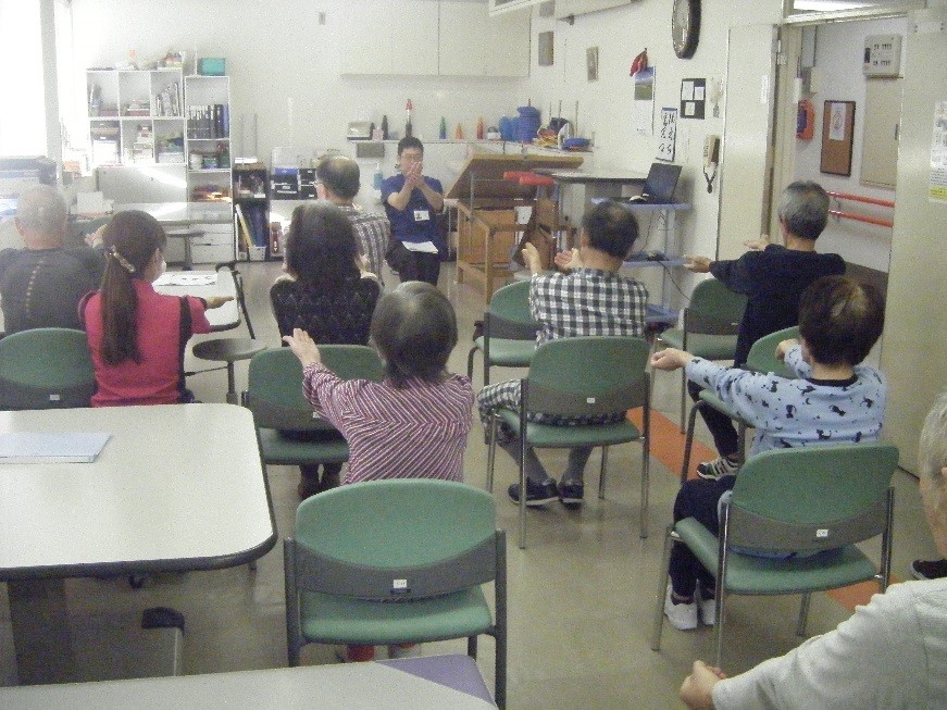 自己練習指導では、椅子に座ってできる運動を参加者と一緒に体を動かしながら運動