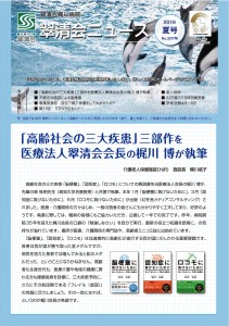 今回の内容は「高齢社会の三大疾患三部作を医療法人翠清会会長の梶川博が執筆」「不確定な原因による脳梗塞」「自宅で嚥下体操をしてみませんか?」「第11回STROKEセミナー」「新人挨拶」「AZE展2016−全国医用画像コンペティション−特別賞受賞!」「学術活動4月~6月」